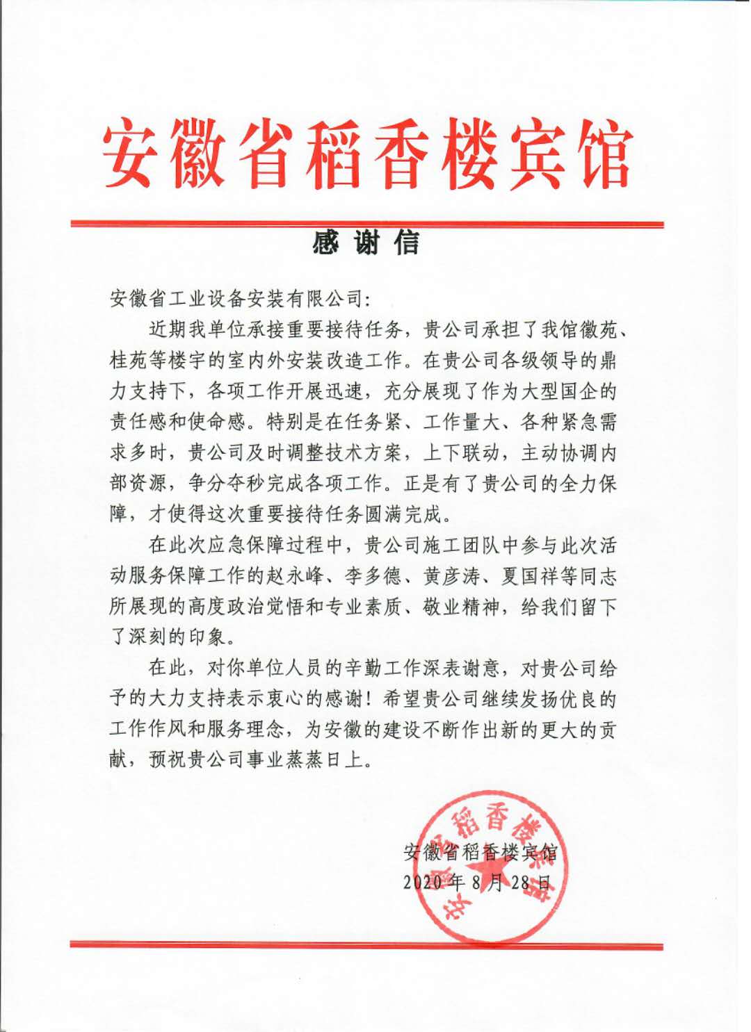 為此,稻香樓賓館發(fā)來(lái)的一封感謝信,感謝安徽安裝公司在近期承擔的稻香樓賓館室內外安裝改造工程任務(wù)中,啟動(dòng)迅速、保障有力、方案得當、上下聯(lián)動(dòng);通過(guò)日夜搶工奮戰,爭分奪秒地完成各項工作,充分發(fā)揮國企擔當的重任。