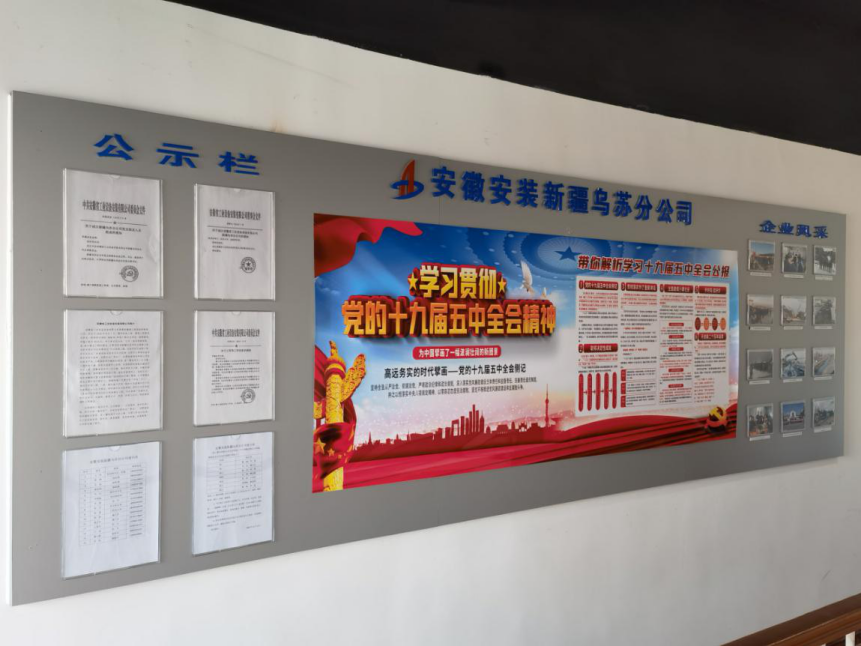 走進(jìn)安徽安裝公司新疆烏蘇分公司辦公區,一塊紅色的黨建公開(kāi)欄首先映入眼簾。公開(kāi)欄還包括黨員風(fēng)采、公示欄、黨務(wù)公開(kāi)、光榮榜等板塊,成為分公司一處醒目的景觀(guān)。