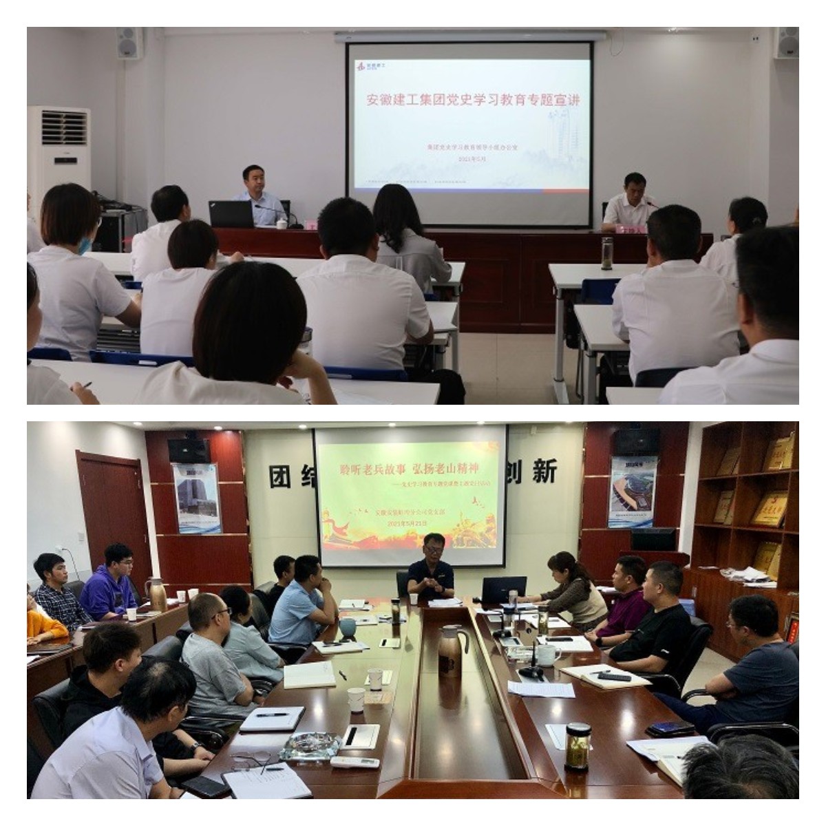 專(zhuān)題宣講課堂。5月27日下午,股份公司黨委委員、副總經(jīng)理黃代,帶領(lǐng)集團黨史學(xué)習教育第十七宣講組成員赴安徽安裝公司開(kāi)展黨史學(xué)習教育專(zhuān)題宣講。公司領(lǐng)導班子成員分赴西安、阜陽(yáng)、蚌埠、合肥等地區分公司及項目一線(xiàn)作黨史學(xué)習教育專(zhuān)題黨課報告。進(jìn)一步將黨史學(xué)習“送學(xué)”到一線(xiàn),確保習總書(shū)記在黨史學(xué)習教育動(dòng)員大會(huì )上的講話(huà)精神落實(shí)到基層,確保公司自上而下扎實(shí)開(kāi)展好黨史學(xué)習教育,將黨史學(xué)習教育的成果轉化為干事創(chuàng )業(yè)的強大動(dòng)力。蚌埠分公司黨支部組織開(kāi)展“聆聽(tīng)老兵故事 弘揚老山精神”黨史學(xué)習教育專(zhuān)題黨課。邀請曾參加過(guò)對越自衛反擊戰的退伍老兵為大家上了一堂別開(kāi)生面的黨課,講述用鮮血和生命捍衛國家領(lǐng)土和民族尊嚴的崢嶸歲月。