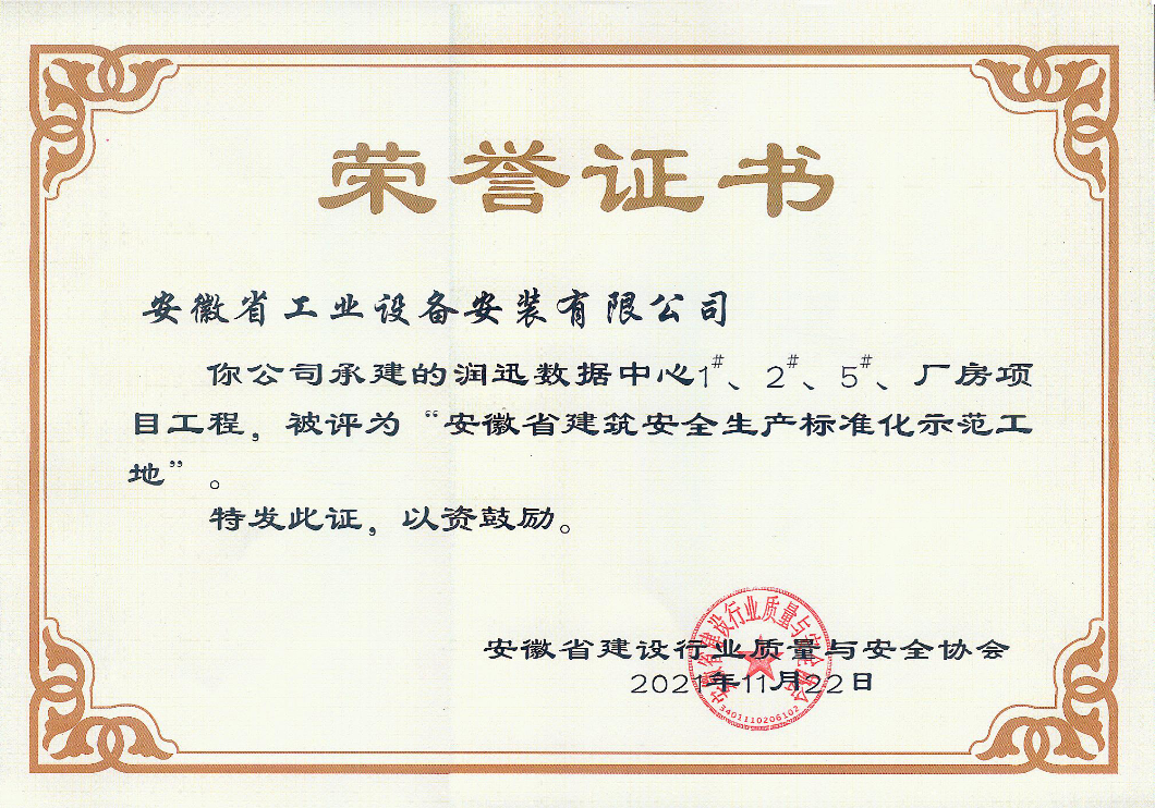 近日,安徽省工業(yè)設備安裝有限公司承建的潤迅數據中心1#、2#、5#廠(chǎng)房項目工程榮獲2021年度“安徽省建筑安全生產(chǎn)標準化示范工地”榮譽(yù)稱(chēng)號。
