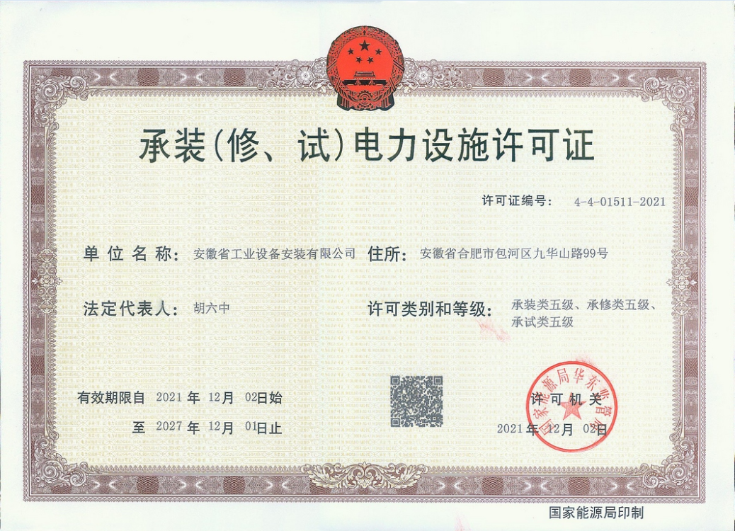 安徽安裝公司順利取得承裝(修、試)電力設施許可證資質(zhì)