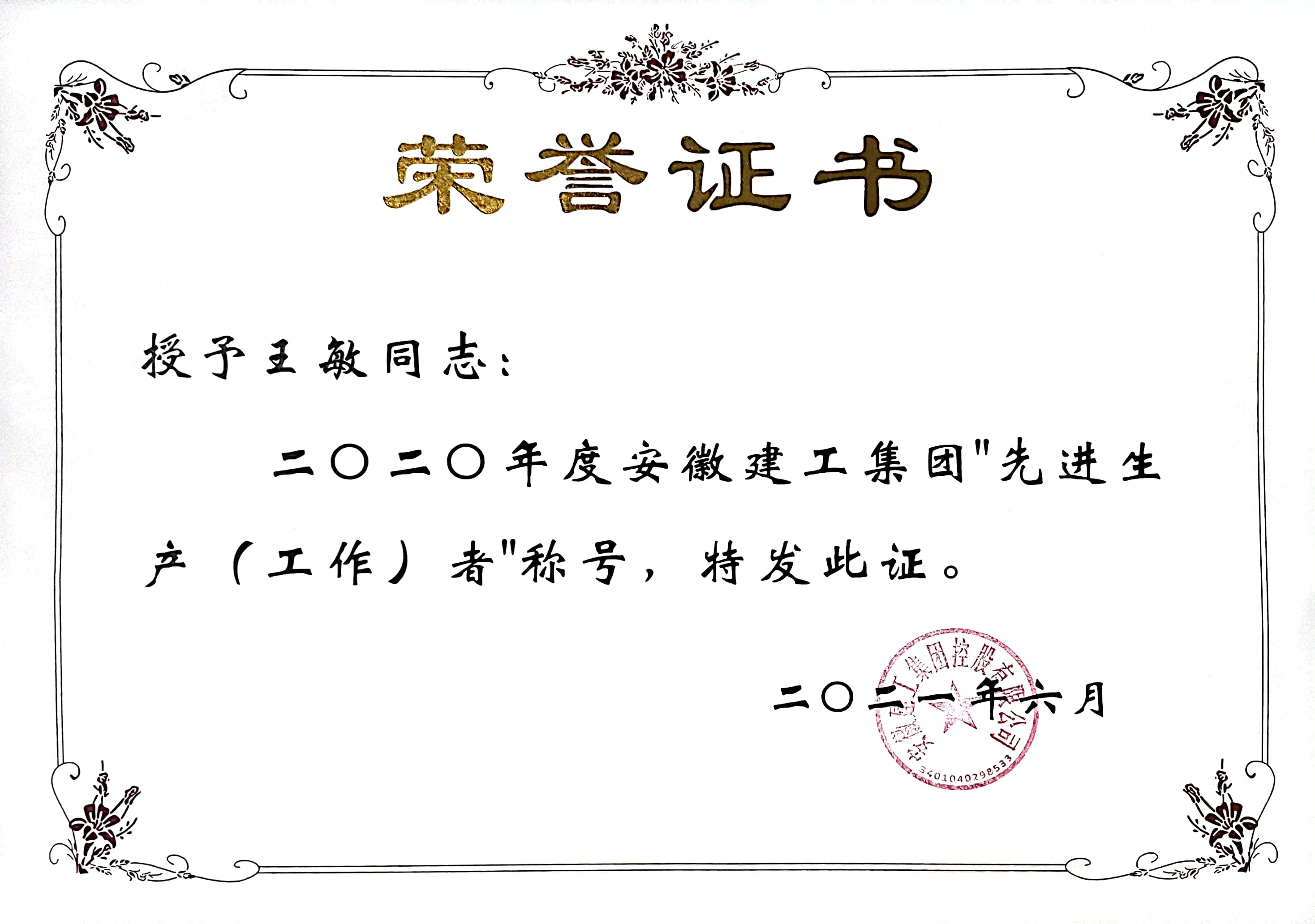 在工作作風(fēng)上,王敏一貫堅持對自己高標準嚴要求,腳踏實(shí)地,勤奮敬業(yè),認真細致,勤于思考,盡心盡責,主動(dòng)、積極地做好每一項工作,認真履行崗位職責。她時(shí)常告誡自己要以德服人,以身作則,并在實(shí)際工作中努力實(shí)踐著(zhù)這一思想 ,注重自己的一言一行,公正、客觀(guān),一切從大局出發(fā),不謀私利,不圖己便,廉潔自律,做到自重、自省、自警和自勵。2021年,王敏由于出色的工作成績(jì),被評為“安徽建工集團2020年度先進(jìn)生產(chǎn)(工作)者”,她說(shuō),這是集團對她過(guò)去工作的肯定,也是對她未來(lái)工作的要求。