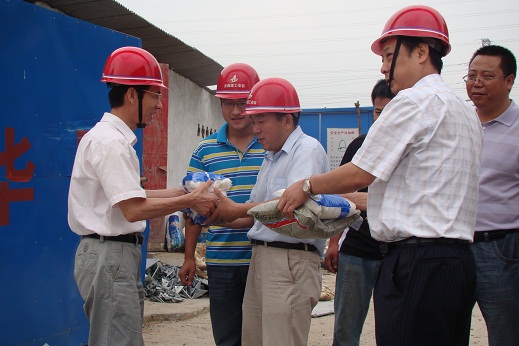張書(shū)記一行首先代表集團公司領(lǐng)導向堅守在項目上的職工表示親切的慰問(wèn)。隨后又認真聽(tīng)取了項目部經(jīng)理李紹林就項目工程概況、項目安全生產(chǎn)、安全保護及創(chuàng )文明示范工地等工作匯報。張書(shū)記勉勵職工要在高溫季節努力做好本職工作,項目部要處處做好防暑降溫工作,保證生產(chǎn)安全,保護好職工的身體健康,保質(zhì)保量的完成工作任務(wù),樹(shù)立安徽省安的品牌形象,把品牌打出去,逐步開(kāi)拓市場(chǎng)。最后,戴書(shū)記代表省安向集團領(lǐng)導冒著(zhù)酷暑親臨慰問(wèn)表示衷心的感謝。他表示:全體省安人將繼續發(fā)揚特別能吃苦、特別能戰斗的精神,戰勝酷暑,奮力攻堅,保證各項工程任務(wù)順利完成。