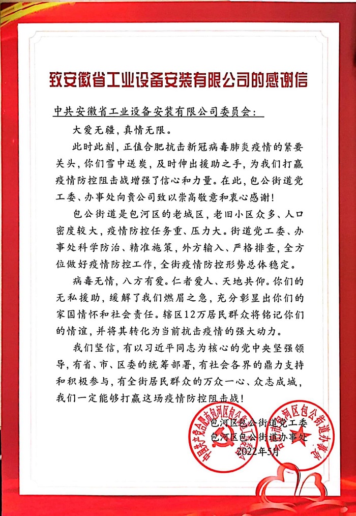 近日,包河區包公街道街道黨工委委員,辦事處副主任劉亮,包河區包公街道炳輝社區黨委書(shū)記房磊給安徽安裝公司送來(lái)了感謝信,信中表達了對安徽安裝公司在合肥抗擊新冠病毒肺炎疫情急要關(guān)頭迎難而上、勇于擔當,積極支援疫情防控的感激之情。