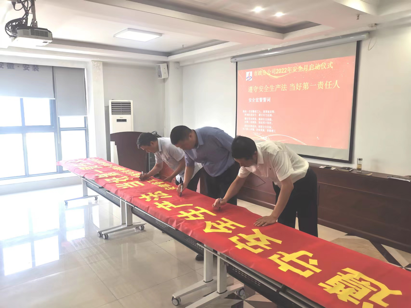 會(huì )議開(kāi)始前首先舉行了市政分公司2022年安全月啟動(dòng)儀式,分公司副經(jīng)理黃彥濤宣讀了第一責任人倡議書(shū),作了分公司安全生產(chǎn)月動(dòng)員講話(huà),與會(huì )人員集體安全宣誓,并在安全月主題條幅上簽名。