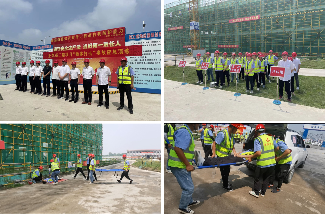 為了落實(shí)公司、分公司安全生產(chǎn)月的各項活動(dòng)部署,進(jìn)一步提升施工現場(chǎng)人員的安全防范意識及應急救援處置能力,6月20日上午10點(diǎn),蚌埠分公司、房建(裝飾)分公司在凱盛科技超薄柔性玻璃二期項目施工現場(chǎng)聯(lián)合開(kāi)展了“物體打擊”事故應急救援演練活動(dòng),公司安全管理部副經(jīng)理蔣秀正、蚌埠分公司領(lǐng)導班子成員、房建(裝飾)分公司領(lǐng)導班子成員、監理單位代表、項目人員共30余人參加演練。