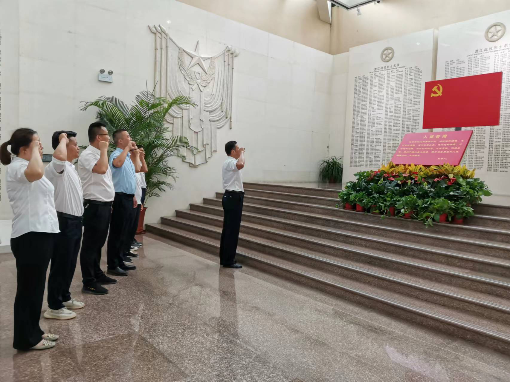 “我志愿加入中國共產(chǎn)黨,擁護黨的綱領(lǐng),遵守黨的章程,履行黨員義務(wù)……”。在渡江戰役紀念館,面對面對鮮紅的黨旗,在分公司黨支部書(shū)記胡迎東的帶領(lǐng)下,全體黨員高舉右手,重溫了入黨誓詞再次作出為共產(chǎn)主義奮斗終身的莊重承諾。
