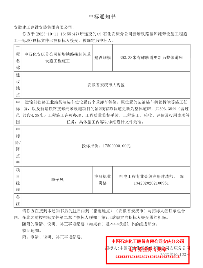 該項目擬對中石化安慶分公司運輸部鐵路工業(yè)站柴油裝車(chē)位設置12個(gè)苯卸車(chē)鶴位,以及新增鐵路接卸純苯設施項目的油2線(xiàn)有砟軌道更新為整體道床,共 393.38 米,計劃工期為71天。此次中標是2023年以來(lái)分公司繼化工園區儲運部六罐區重大安全風(fēng)險消減治理項目以及2023年5月-2025年4月工程建設項目施工總承包框架協(xié)議項目?jì)蓚€(gè)項目中標后,連續在中石化安慶分公司中標的第三個(gè)項目,也是分公司中標的首個(gè)鐵路整體道床施工項目。