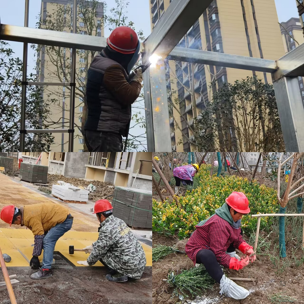 圖為:舒城縣青墩小區項目坡道鋼結構雨棚焊接、人行道鋪裝及綠化種植施工