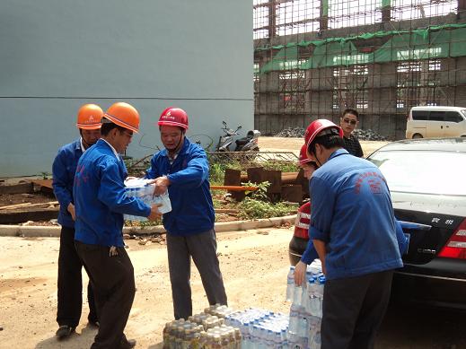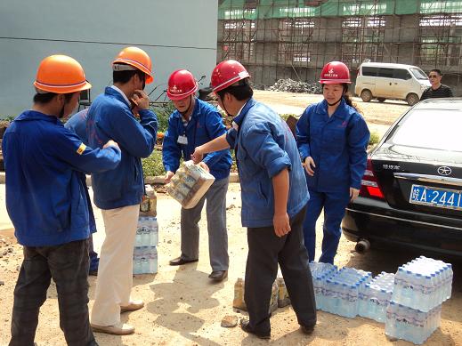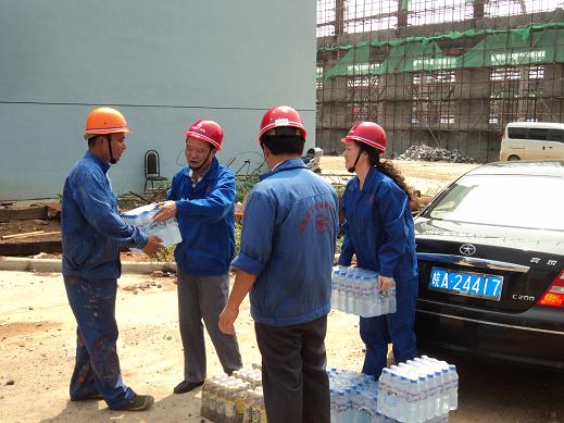 7月28日,氣溫高達36度,酷暑難耐,分公司書(shū)記、經(jīng)理李貴林,副經(jīng)理史崇松、方斌、劉紅艷一行深入一線(xiàn)工地,慰問(wèn)戰斗在一線(xiàn)的生產(chǎn)、管理人員。每到一處,李貴林同志都會(huì )關(guān)切的詢(xún)問(wèn)防暑和安全情況,并將一箱箱礦泉水送到一線(xiàn)人員的手中,使他們在夏日里感受到了一縷清爽的涼風(fēng)。