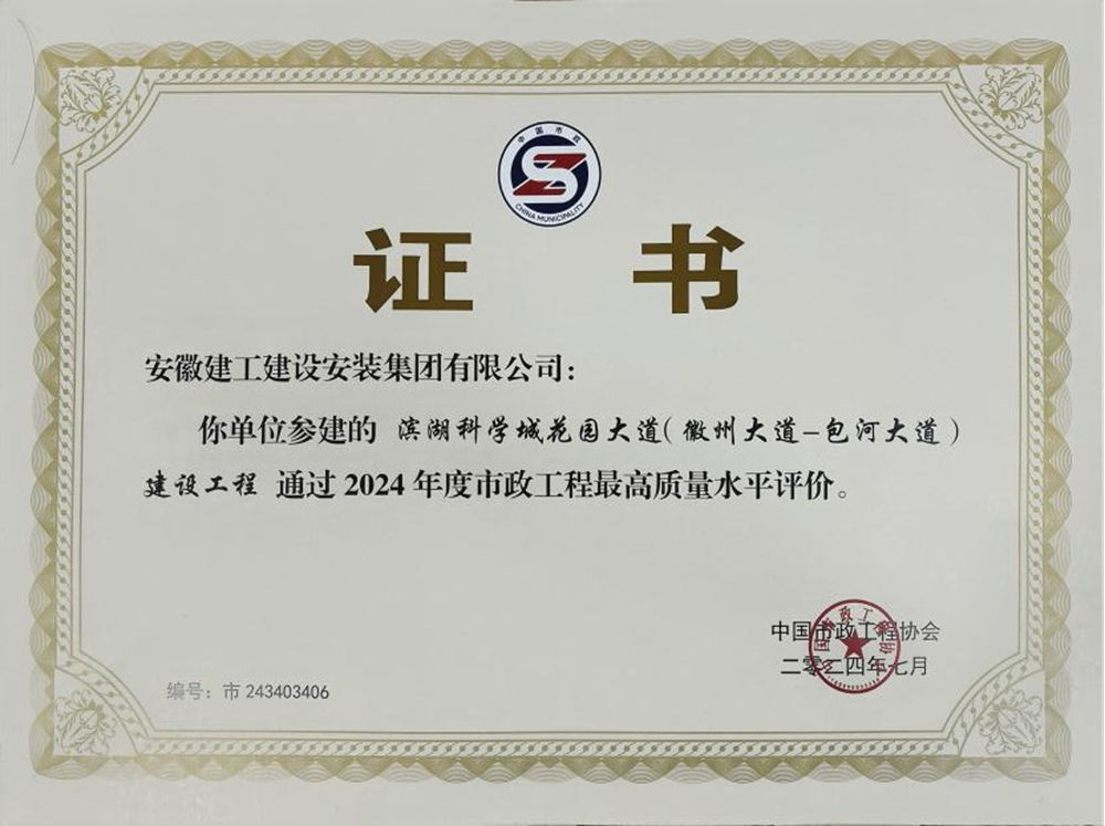 近日,中國市政工程協(xié)會(huì )頒發(fā)了2024年度市政工程最高質(zhì)量水平評價(jià)獎證書(shū),建工安裝合肥分公司濱湖科學(xué)城花園大道(徽州大道-包河大道)建設工程項目榮獲市政工程最高質(zhì)量水平評價(jià)獎,這是本項目繼榮獲“華東優(yōu)質(zhì)安裝工程獎”、“黃山杯”之后的又一國家級獎項。
