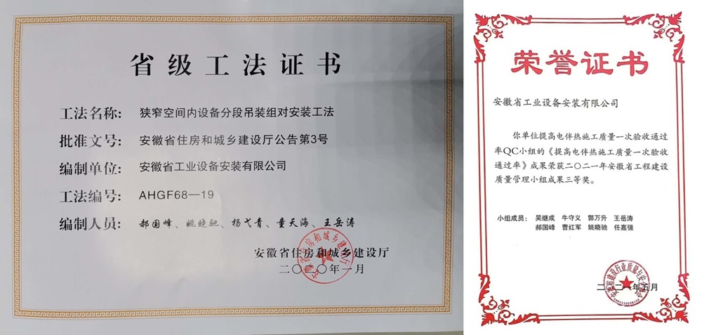在繁忙的工作之余,姚曉馳對專(zhuān)業(yè)知識的探索與熱愛(ài)從未有片刻停歇。他仿若一位求知若渴的行者,積極主動(dòng)地在知識的海洋中破浪前行,持續拓寬并深化自身的知識體系。他參與研發(fā)的《狹窄空間內設備分段吊裝組對安裝工法》成功榮獲安徽省住房和城鄉建設廳頒發(fā)的省級工法稱(chēng)號,《提高電伴熱施工質(zhì)量一次驗收通過(guò)率》也榮獲了安徽省工程建設質(zhì)量管理小組成果三等獎。