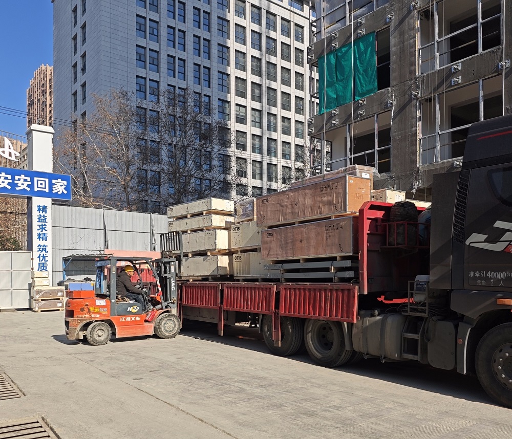分公司商機廠(chǎng)租賃住房項目電梯到貨,現場(chǎng)施工人員正在準備卸貨