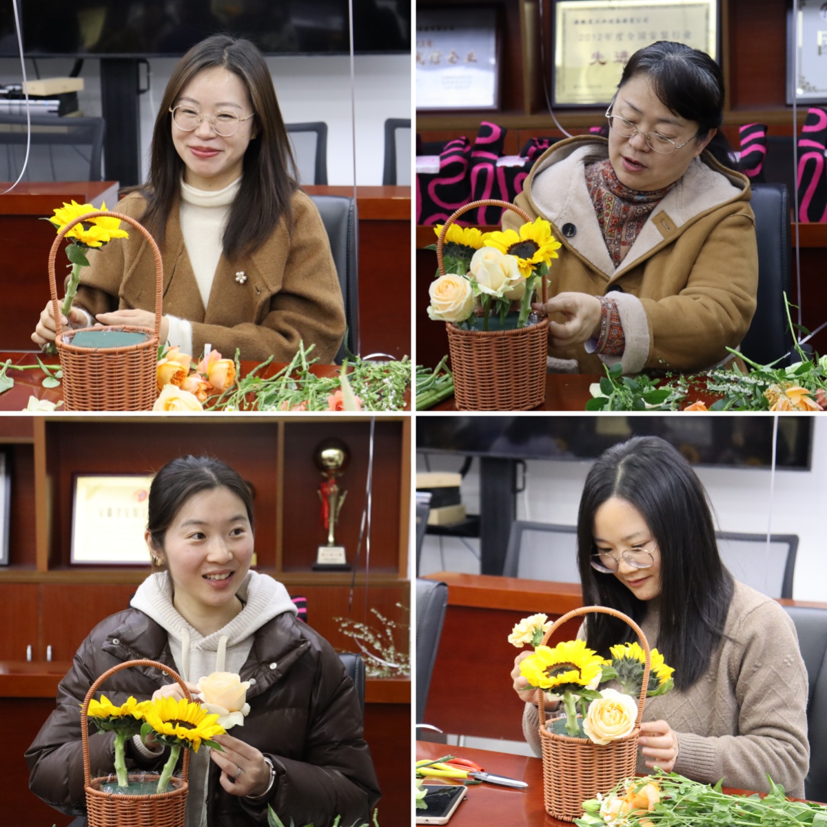 活動(dòng)現場(chǎng)花香四溢,充滿(mǎn)著(zhù)春天的氣息,專(zhuān)業(yè)花藝師從花材特性、色彩美學(xué)到造型構思向大家進(jìn)行了系統講解并進(jìn)行了現場(chǎng)演示。女職工們興致盎然、躍躍欲試,充分發(fā)揮自己的想象力,以高漲的熱情投入到插花創(chuàng )作中,紛紛化身“春日設計師”,將玫瑰的熱烈、百合的芬芳、向日葵的陽(yáng)光巧妙組合,在修剪與構思中展現女性的細膩匠心。大家一邊插花創(chuàng )作,一邊互相交流著(zhù)自己的想法和創(chuàng )意,現場(chǎng)充滿(mǎn)了歡聲笑語(yǔ)、其樂(lè )融融。