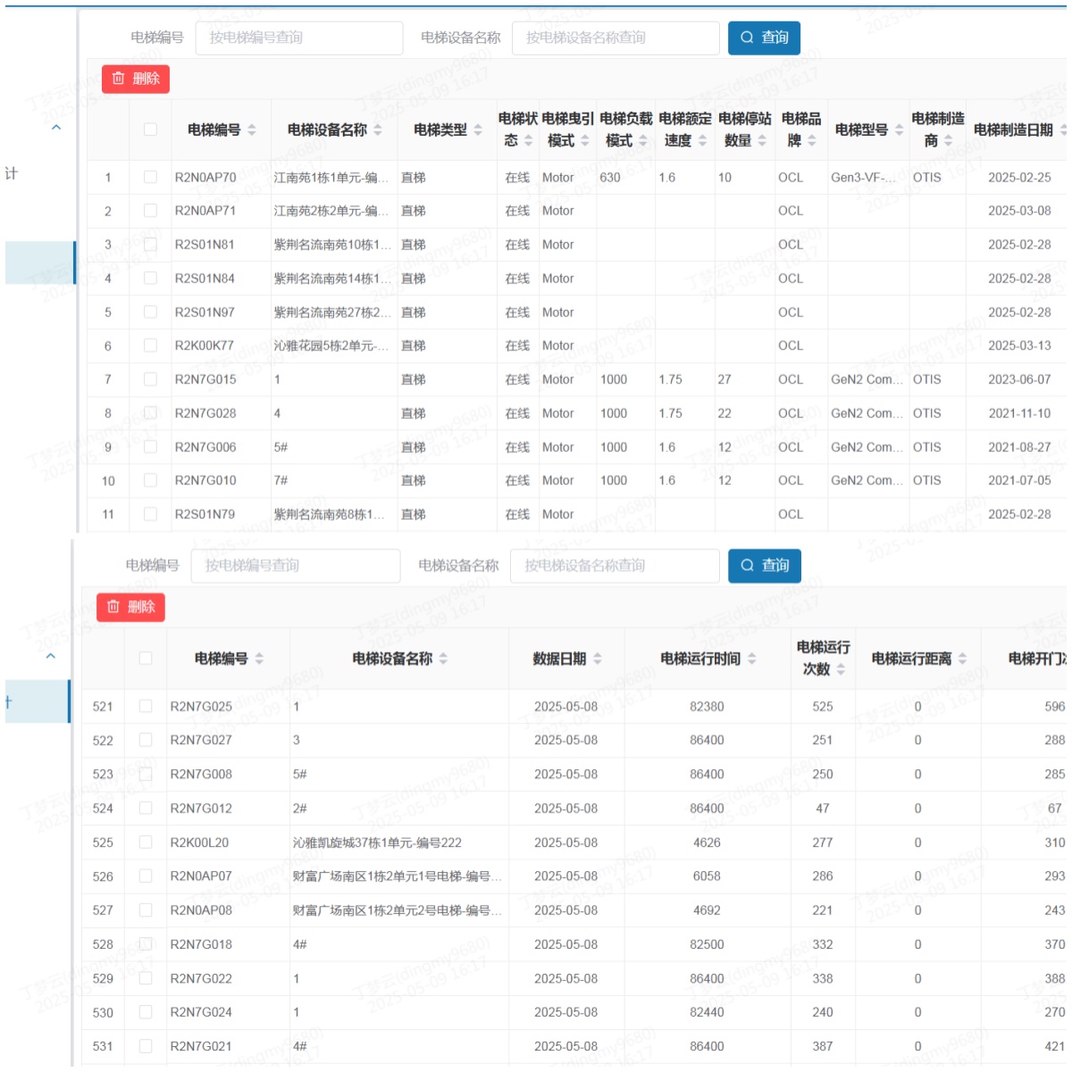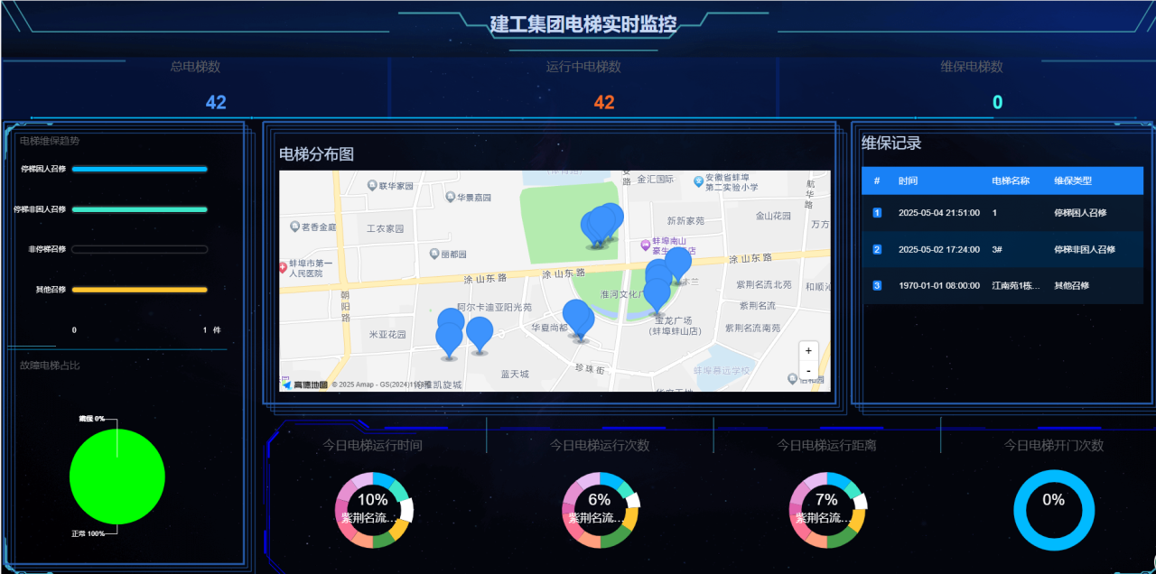 新搭建的電梯管理模塊構建起高效的數據互通橋梁,不僅能夠實(shí)時(shí)獲取已上線(xiàn)電梯編號、電梯設備名稱(chēng)等各項基礎數據,還能精準監測電梯運行時(shí)間、運行距離、運行次數、開(kāi)門(mén)次數等動(dòng)態(tài)數據信息。該系統可全程追蹤電梯召修記錄,詳細記錄召修維保上報時(shí)間、電梯維保人員到場(chǎng)時(shí)間,以及電梯故障處理過(guò)程、因故障困人后的解救時(shí)間等信息。這些數據的全面整合與實(shí)時(shí)呈現,能夠全方位、立體化掌握每臺電梯的運行狀態(tài)及故障率,增強了電梯運行的安全性和可靠性,有效提升電梯維保效率。