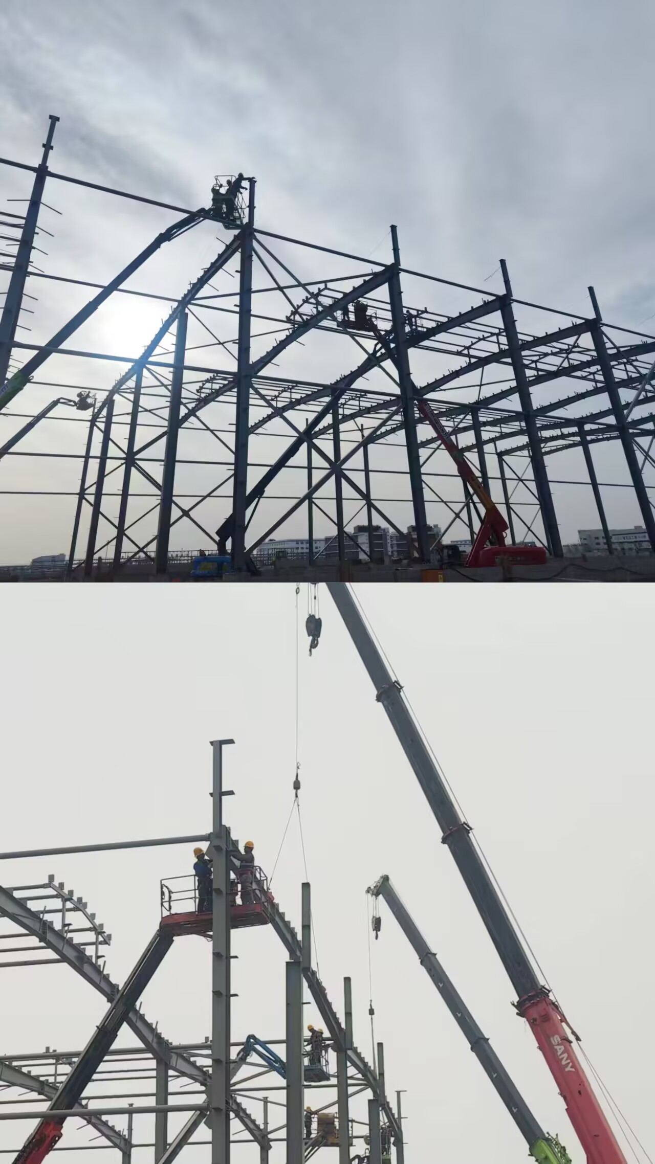 走進(jìn)項目施工現場(chǎng),起重機揮動(dòng)著(zhù)粗壯的鋼鐵臂膀劃破天際,將一段段鋼梁精準的吊裝至安裝位,曲臂車(chē)托舉著(zhù)工人將鋼構件嵌入到預定位置,保障高空作業(yè)人員的生命安全。這是力量與技術(shù)的二重奏,更是安全與效率的完美平衡,一幅現代工業(yè)建筑的壯美畫(huà)卷正徐徐展開(kāi)。