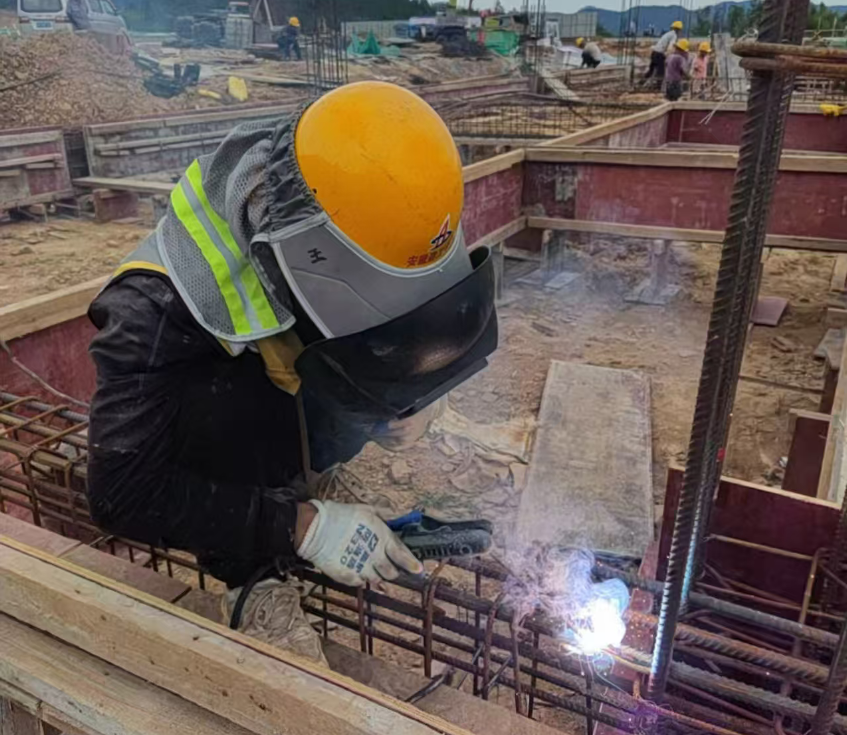 工人穿著(zhù)汗透的工作服冒著(zhù)酷暑進(jìn)行基礎防雷接地焊接
